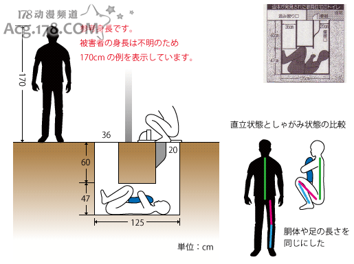 后来据警方报告称该被害者的死因为“冻伤兼胸部循环障碍”,也就是在狭窄的场所被冻死。这也不难理解,因为被发现时被害者在大冬天赤裸着上身,但除此之外身上没有任何明显外伤。虽然最后警方得出的结论是“被害者S想要进去便槽偷窥该女性教师结果出不来”,但该事件确实让人匪夷所思,排污口的直径为36cm但20-29岁男性的平均肩宽为40.4cm,那么他究竟是怎么进去的呢?